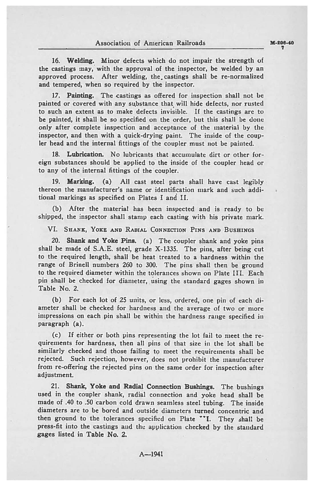 M-206-40. Acceptance of A.A.R. Tight Lock Couplers and Coupler Parts, Radial Connections, Yokes, and Attachment Parts.